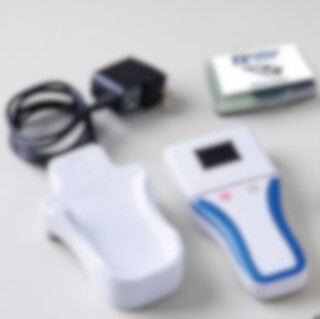 De olika komponenterna i OccluSense-systemet består av den handhållna enheten, induktiv laddare, en testsensor och