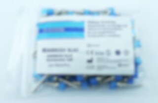 Den blå färgkodningen indikerar borstens grovlek, som används för att avlägsna ojämnheter och förbereda ytan för efterföljande polersteg. Borstens geometri och styvhet är optimerad för att ge god kontroll vid polering av hårda restaureringsmaterial, vilket underlättar skapandet av en jämn ytstruktur.