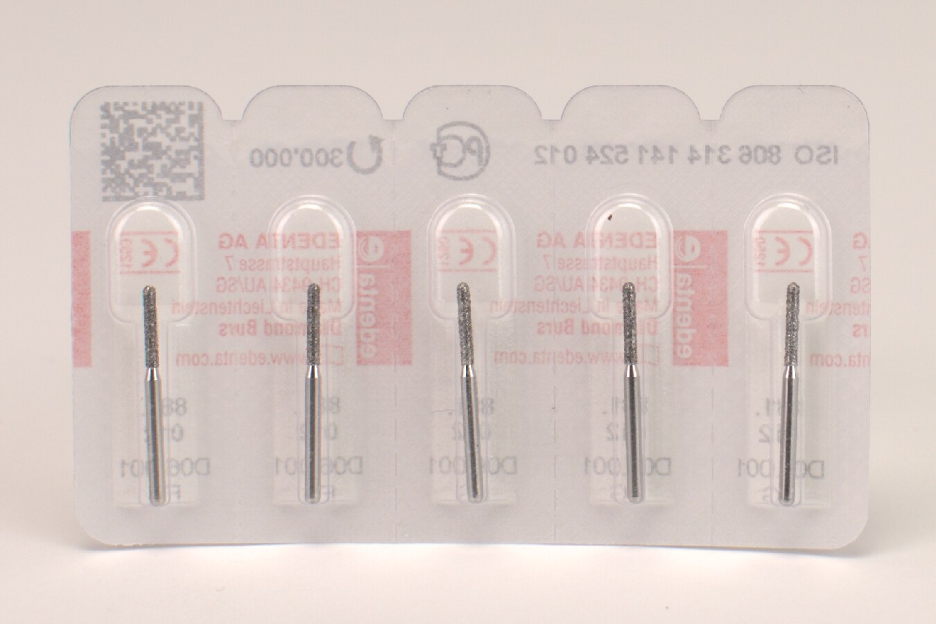 Borrarna levereras i en förpackning om 5 stycken. De är försedda med ett normalstort diamantkorn, vilket bidrar till effektiv och kontrollerad slipning. Den cylinderrunda formen (Figur 881) och ISO-storlek 012 gör den användbar för en rad olika behandlingsområden. Med ett FG-skaft (314) är den kompatibel med vanliga höghastighetshandstycken.