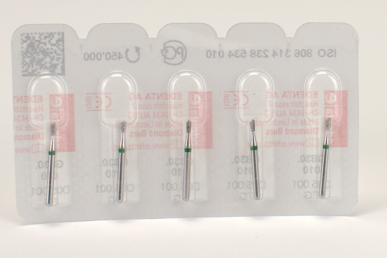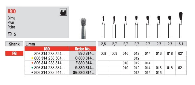 Borr FG G 830.010 är tillverkad med diamantkorn av grov storlek, vilket möjliggör effektiv materialreduktion vid bearbetning. Den päronformade arbetsdelen, med ISO-storlek 010, har en längd på 2,7 mm. Borren är utrustad med ett 314 FG-skaft (friction grip) med en total längd på 19 mm, vilket säkerställer stabil infästning i dentalhandstycken. Dess gröna färgkod indikerar grov kornstorlek enligt standard för dentala roterande instrument.