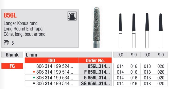 Instrumentet är försett med ett standardiserat FG-skaft (Friction Grip) för användning i turbinvinkelstycken. Borret är konstruerat för att bibehålla sin formstabilitet under användning och levereras i en förpackning om 5 stycken.