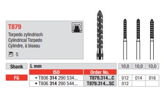 Borren har en figurkod T879, vilket indikerar dess kombinerade torped- och cylindriska arbetsdel. Det grova diamantkornet är idealiskt för snabb och kontrollerad borttagning av tandsubstans och fyllnadsmaterial. Borren är försedd med ett 314 FG skaft, anpassat för användning i höghastighetsturbiner, och har en ISO-storlek 016, vilket motsvarar en diameter på 1.6 mm. Färgmärkningen är grön, vilket bekräftar det grova diamantkornet. Produkten levereras i en förpackning om fem stycken, vilket säkerställer tillgång för flera behandlingar.