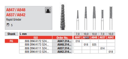Diamanten har en konisk figur med rak topp (A848), vilket möjliggör kontrollerad formning vid preparation. Instrumentets yta är belagd med diamantkorn i grov storlek, framtaget för att optimera balansen mellan avverkningshastighet och ytfinish. Rapid Grinder-designen är utvecklad för att underlätta materialtransport och minska risken för igensättning under pågående arbete.