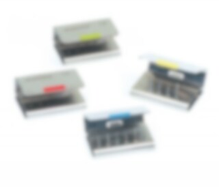 Rostfritt borrställ med självlåsande lock. Levereras med fyra utbytbara silikon-markeringar (blå, gul, röd, grön). För 12 FG och 5 VST. Styck.