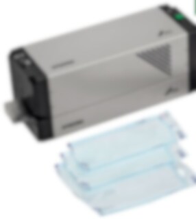 Foliesvets som förseglar sterilförpackningarna på ett löpande band. Steglöst inställbar förseglingstemperatur.